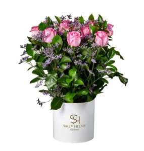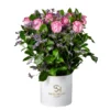 Sally Helmy’s Amorousness elegant flower bouquet features lush pink roses with delicate purple Laminyom, blending romance and sophistication.