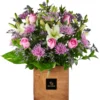This special flower arrangement is a beautiful and elegant way to express your feelings. The arrangement is presented in a charming wooden box, which adds a touch of rustic charm to the overall design. The arrangement features a mix of delicate white lilies, soft pink roses, and vibrant purple spider flowers, creating a stunning display that is sure to impress.