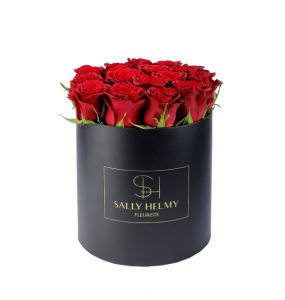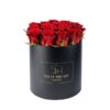 Black round box of 15 red roses height-Diameter 18cm.