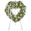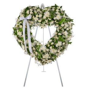 GREETINGS Bouquet by Sally Helmy, A heart-shaped wreath of pure white chrysanthemums symbolizes innocence, love, and compassion.