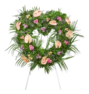 This heart-shaped arrangement of vibrant Pink & Purple roses, peach anthuriums, Limonium flower, and lush greenery is now elevated to touch your senses of sight with beauty and freshness.