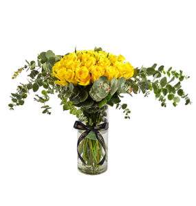 Sally Helmy’s elegant bouquet thoughtfully combines the cheerful warmth of yellow roses with eucalyptus’s fresh, aromatic qualities.