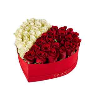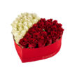 43 White & Red Roses in a Heart shape made of red velvet fabric.