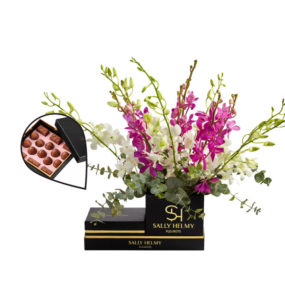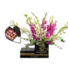 Accompanying this stunning floral display is a collection of indulgent chocolates, all presented in a sleek black box.