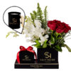 Set of 7 red roses and 5 white baby orchids in 14 X 14 cm black box and Scented Candle filled in galvanized steel container 10 cm Highest and 8.5 cm Diameter.