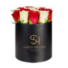 15 Dark pink with white roses in our black round box.