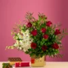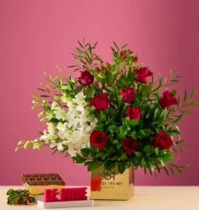With passionate red roses, elegant white orchids, and lush green foliage, it’s a love letter in bloom.