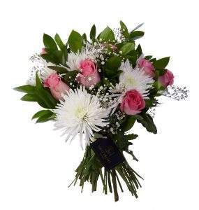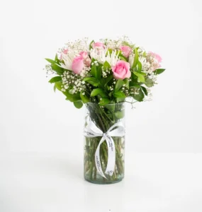 The SH0024 bouquet exudes charm with pink roses and chrysanthemums in a clear vase. Pink symbolizes affection and admiration, offering a natural flowers gift of gentle love and appreciation.