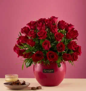 Let your love bloom this Valentine’s Day with our exquisite “Pleasure” bouquet. This stunning arrangement of vibrant red roses speaks volumes about your deepest emotions.