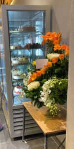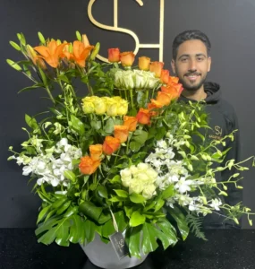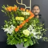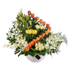 The inclusion of white roses, along with lilies and orchids, adds a touch of purity and serenity to the arrangement.
