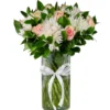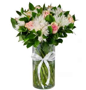 يتألف البوكيه من مجموعة ورود أنيقة، تتمثل في ورود ذات اللون الوردي مع لمسة من الورود البيضاء الكريزانتيم، وإضافة مميزة تشعرك بالطبيعية مع الزهور الخضراء المبهجة، كلا يتجمع في فازا شففة تظهر جمال البوكيه وتلاعب حاسة البصر لمن تحب منذ الثانيه الأولي.