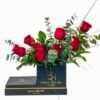 A long-stemmed red roses, symbolizing passionate love, are nestled amidst lush eucalyptus leaves, adding a touch of freshness and sophistication, with adding alongside tasty chocolate that boosts mood.