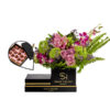 What she/he really wants is flowers with chocolate. Surprise her with this beautiful bouquet of purple roses, baby orchids and snowballs – plus 16 pieces of Belgian Milky Chocolate to complete the experience.