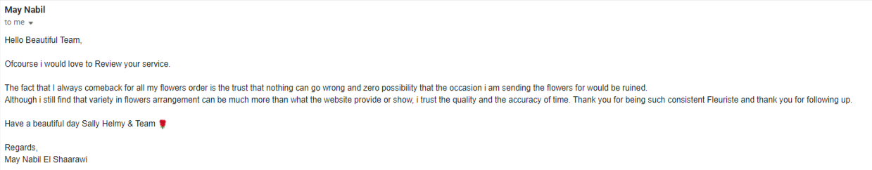 Although i still find that variety in flowers arrangement can be much more than what the website provide or show, i trust the quality and the accuracy of time. Thank you for being such consistent Fleuriste and thank you for following up.