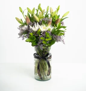 The SH0289 bouquet radiates elegance with white lilies, chrysanthemums, and purple accents in a clear vase. White symbolizes purity and peace, while purple signifies admiration and charm, making it a natural flowers gift of serene love.