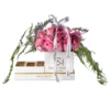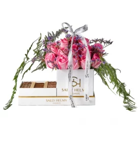 Nestled in a pristine white box, tied with a luxurious ribbon, and paired with a delicious chocolate box, this bouquet appeals not only to feelings but to the senses—sight, touch, and taste—creating an unforgettable experience for your loved one.