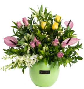 Bold yet graceful — The King blends yellow roses, lavender touches, and lush greens in a bouquet that brings warmth, elegance, and pure emotion.