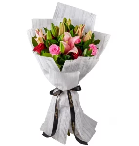 Embrace the beauty of Sally Helmy’s Tidy Bouquet, featuring delicate pink roses and elegant pink lilies wrapped in soft white paper.