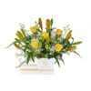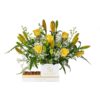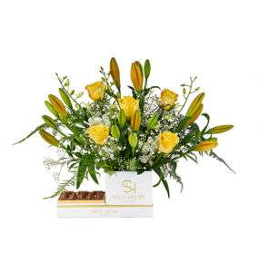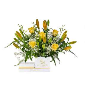 With vibrant yellow roses, lilies, and delicate baby Orchid, this arrangement radiates warmth, joy, and admiration.